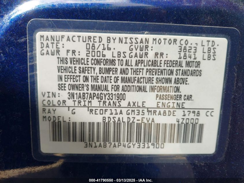 Color BlueCylinders 4Drive Front wheel driveVIN 3N1AB7AP4GY******State Run & Drive VerifiedDamage Back AutoRIA