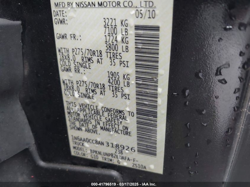2010 NISSAN TITAN 2010 Gasoline, 5.6, Full drive, VIN - 1N6AA0CC8AN****** from the USA