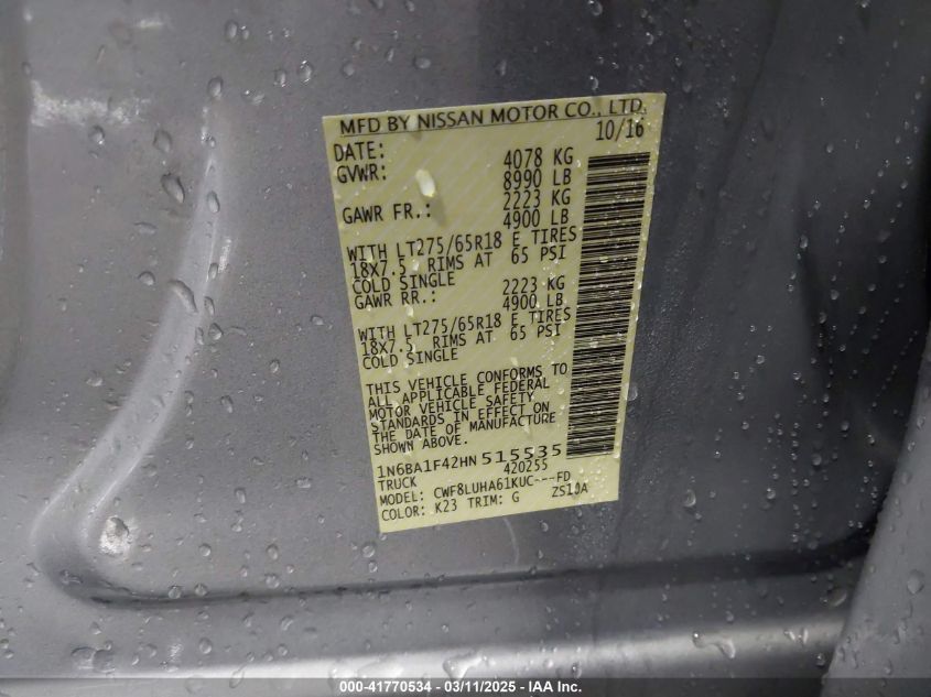 2017 NISSAN TITAN 2017 Diesel, 5.0, Full drive, VIN - 1N6BA1F42HN****** from the USA