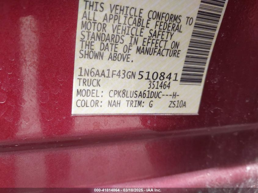 Color RedCylinders 8Drive Full driveVIN 1N6AA1F43GN******State Run & Drive VerifiedDamage Right side AutoRIA
