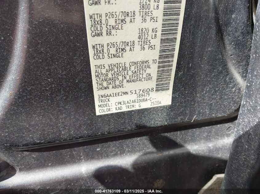 Color GrayCylinders 8Drive UnknownVIN 1N6AA1EE2MN******State Run & Drive VerifiedDamage Front left