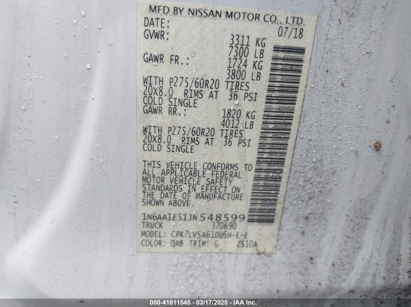 Color WhiteCylinders 8Drive Full driveVIN 1N6AA1E51JN******State Run & Drive VerifiedDamage Right side AutoRIA
