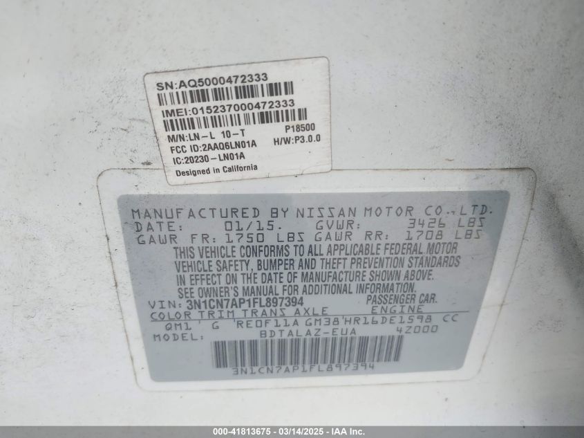 Color WhiteCylinders 4Drive Front wheel driveVIN 3N1CN7AP1FL******State Run & Drive VerifiedDamage Left side AutoRIA