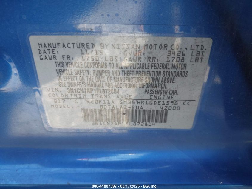 Color BlueCylinders 4Drive Front wheel driveVIN 3N1CN7AP1FL******State Run & Drive VerifiedDamage Insignificant AutoRIA