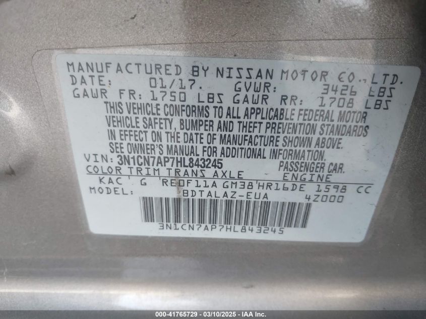 Color GrayCylinders 4Drive Front wheel driveVIN 3N1CN7AP7HL******State Run & Drive VerifiedDamage Front or backAuction date 2025-03-20 AutoRIA