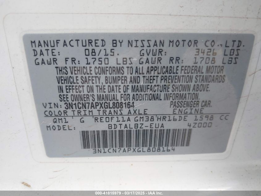 2016 NISSAN VERSA 2016 Gasoline, 1.6, Front wheel drive, VIN - 3N1CN7APXGL****** from the USA