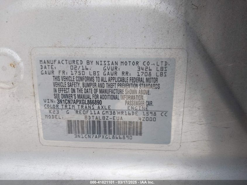 Color SilverCylinders 4Drive Front wheel driveVIN 3N1CN7APXGL******State Run & Drive VerifiedDamage Front or back AutoRIA