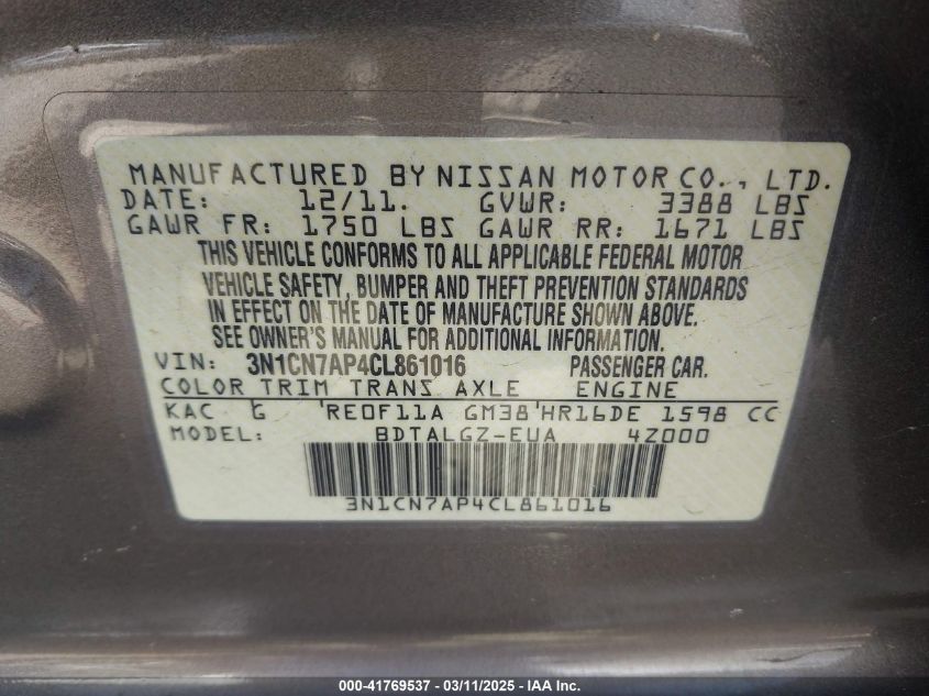 2012 NISSAN VERSA 2012 Gasoline, 1.6, Front wheel drive, VIN - 3N1CN7AP4CL****** from the USA