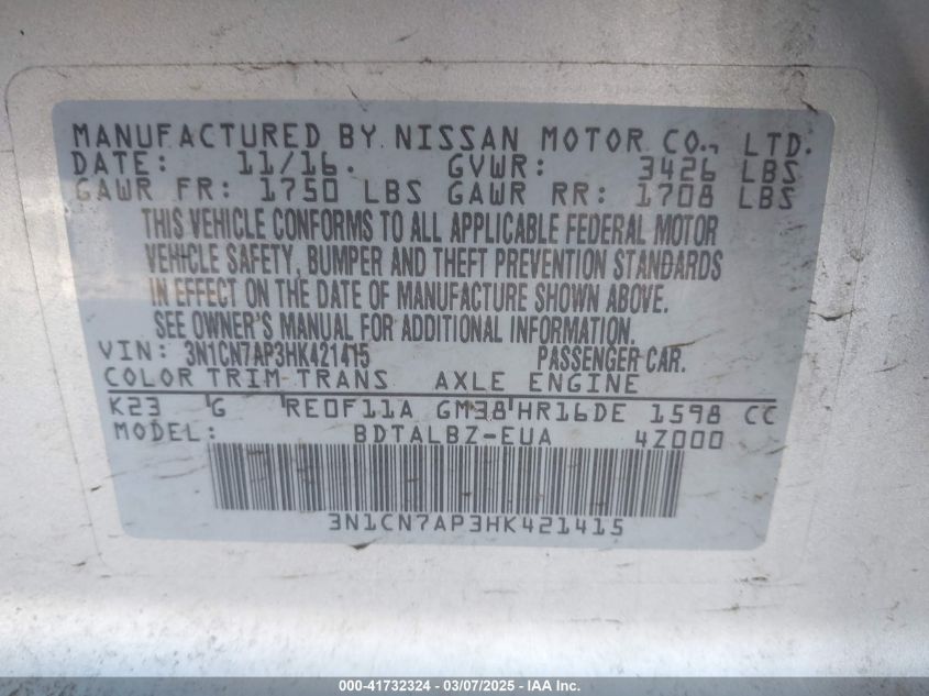 2017 NISSAN VERSA 2017 Gasoline, 1.6, Front wheel drive, VIN - 3N1CN7AP3HK****** from the USA