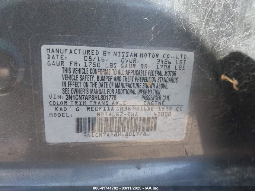 Color GrayCylinders 4Drive Front wheel driveVIN 3N1CN7AP8HL******State Run & Drive VerifiedDamage Front or back AutoRIA