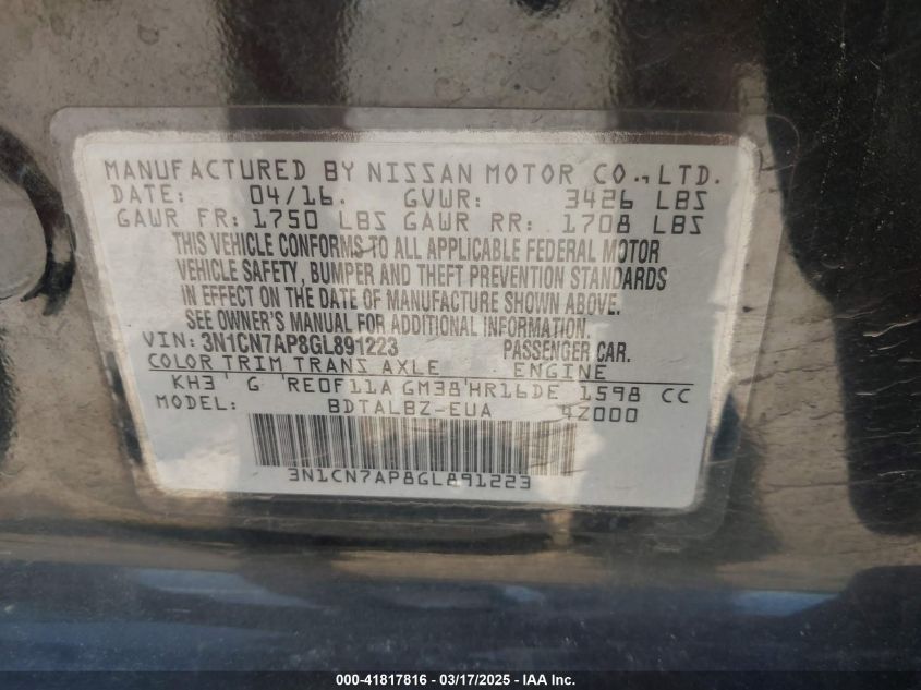 Color BlackCylinders 4Drive Front wheel driveVIN 3N1CN7AP8GL******State Run & Drive VerifiedDamage Back AutoRIA