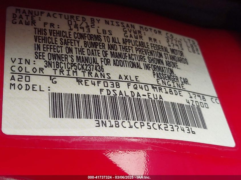 Color RedCylinders 4Drive Front wheel driveVIN 3N1BC1CP5CK******State Run & Drive VerifiedDamage Back AutoRIA