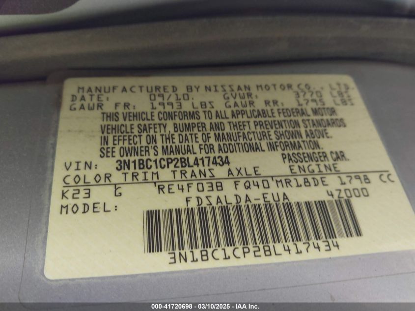 Color SilverCylinders 4Drive Front wheel driveVIN 3N1BC1CP2BL******State Run & Drive VerifiedDamage Front or backAuction date 2025-03-25