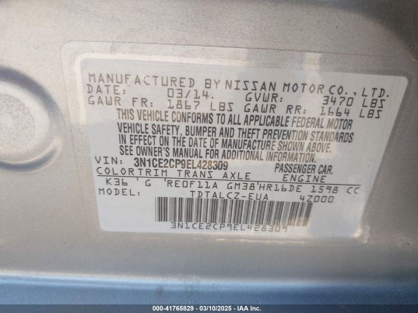 Color GrayCylinders 4Drive Front wheel driveVIN 3N1CE2CP9EL******State Run & Drive VerifiedDamage InsignificantAuction date 2025-03-24 AutoRIA