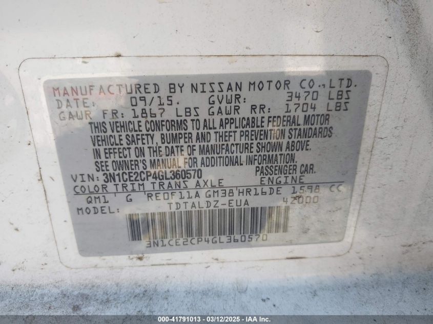 Color WhiteCylinders 4Drive Front wheel driveVIN 3N1CE2CP4GL******State Run & Drive VerifiedDamage Right side AutoRIA