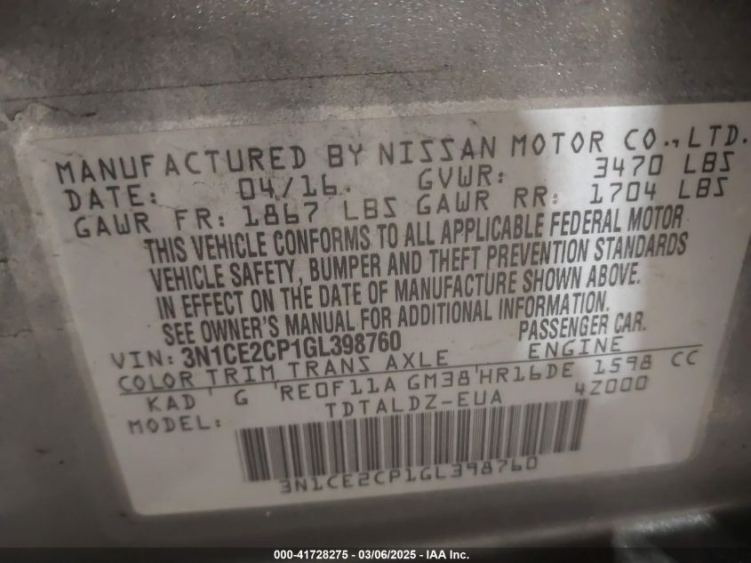 2016 NISSAN VERSA NOTE 2016 Gasoline, 1.6, Front wheel drive, VIN - 3N1CE2CP1GL****** from the USA