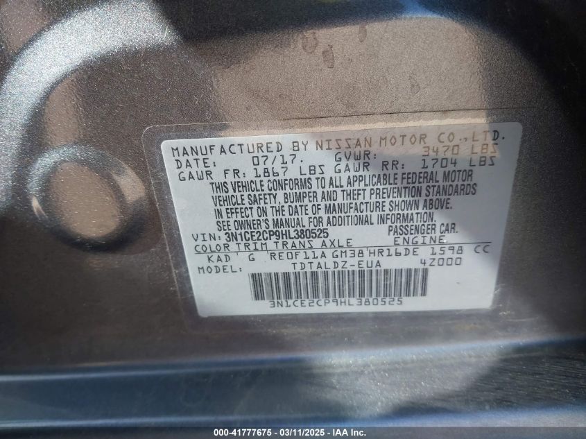 2017 NISSAN VERSA NOTE 2017 Gasoline, 1.6, Front wheel drive, VIN - 3N1CE2CP9HL****** from the USA