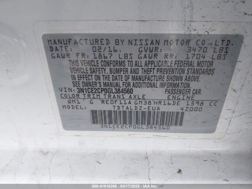 2016 NISSAN VERSA NOTE 2016 Gasoline, 1.6, Front wheel drive, VIN - 3N1CE2CP0GL****** from the USA