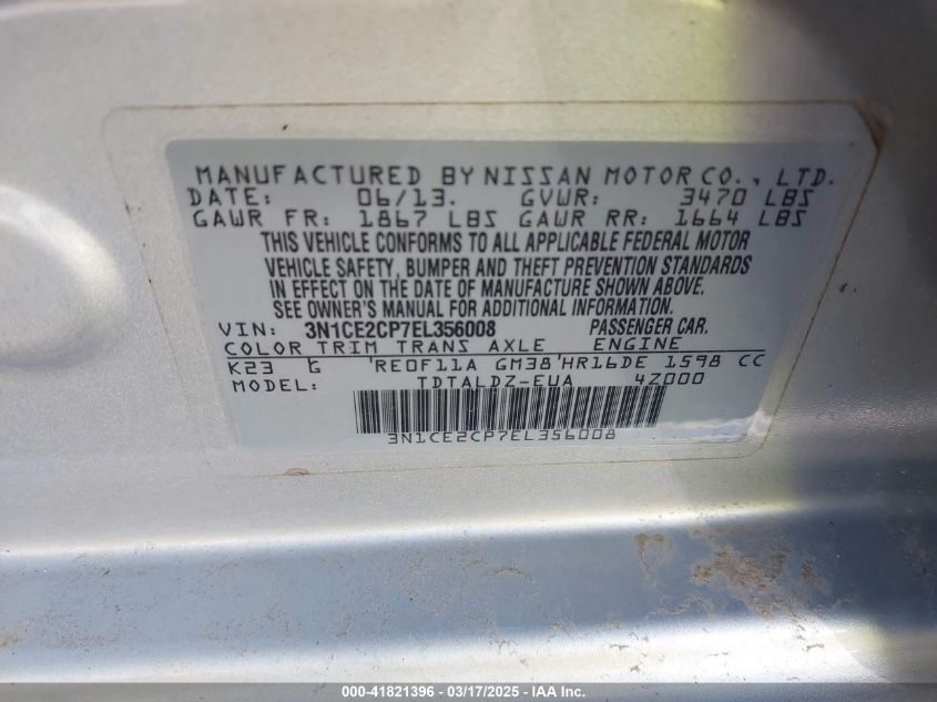 Color SilverCylinders 4Drive Front wheel driveVIN 3N1CE2CP7EL******State Run & Drive VerifiedDamage InsignificantAuction date 2025-03-20 AutoRIA