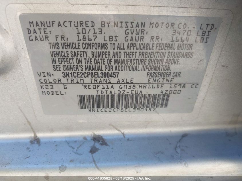 Color SilverCylinders 4Drive Front wheel driveVIN 3N1CE2CP8EL******State Run & Drive VerifiedDamage Front or back AutoRIA