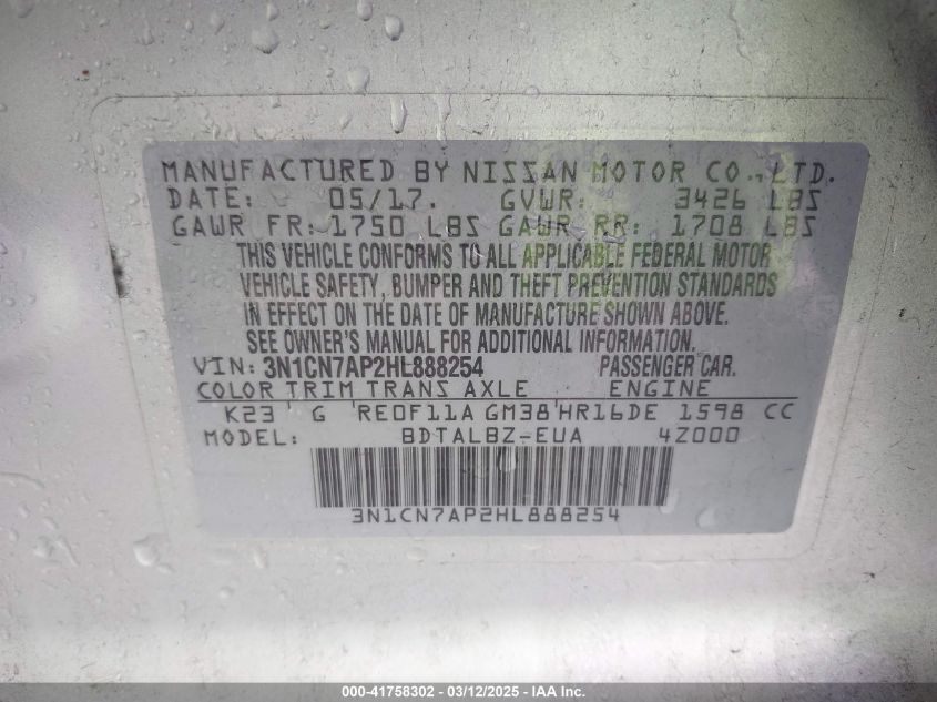 Color SilverCylinders 4Drive Front wheel driveVIN 3N1CN7AP2HL******State Run & Drive VerifiedDamage Front or back AutoRIA