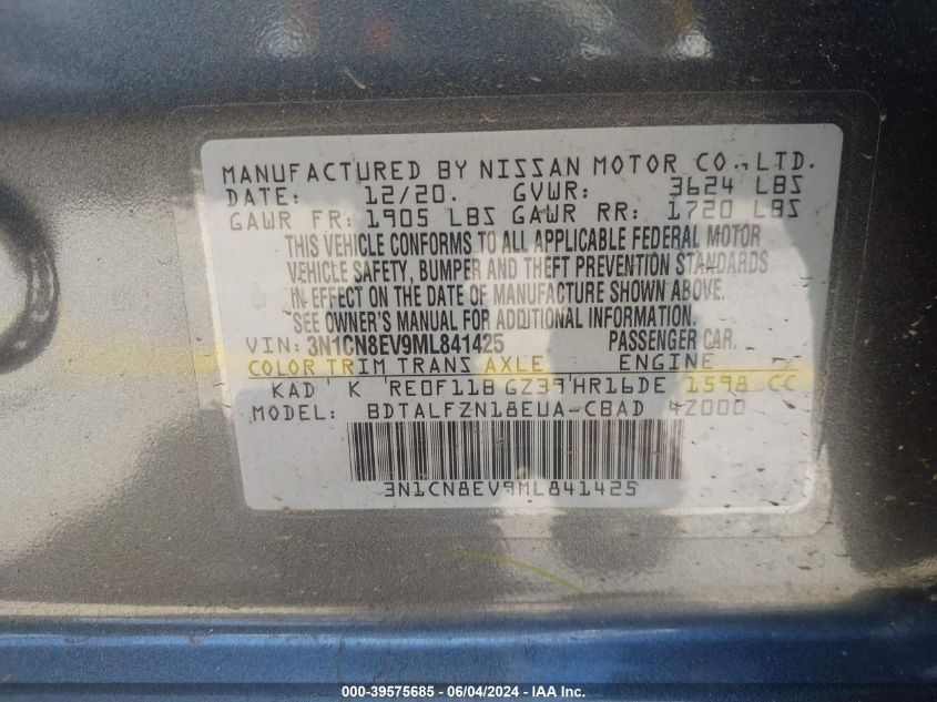 Color GrayCylinders 4Drive Front wheel driveVIN 3N1CN8EV9ML******State Run & Drive VerifiedDamage Front or backAuction date 2025-03-20 AutoRIA
