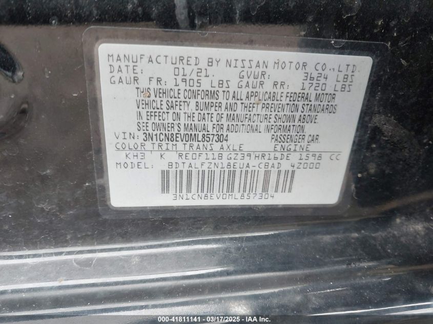 Color BlackCylinders 4Drive Front wheel driveVIN 3N1CN8EV0ML******State Run & Drive VerifiedDamage Rear left AutoRIA