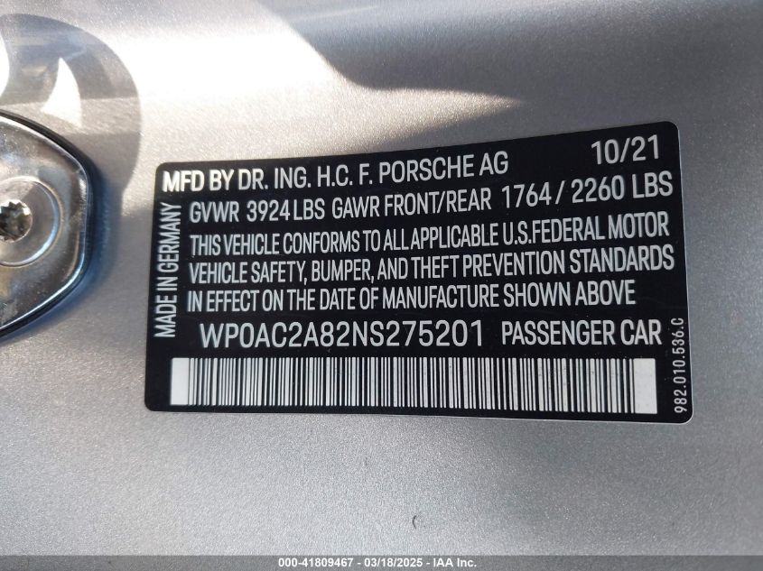Color SilverCylinders 6Drive Rear wheel driveVIN WP0AC2A82NS******State Run & Drive VerifiedDamage Front or back