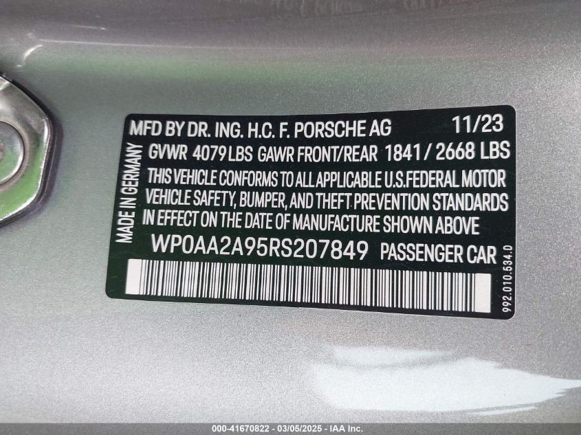 Color SilverCylinders 6Drive Rear wheel driveVIN WP0AA2A95RS******State Run & Drive VerifiedDamage Front or back AutoRIA