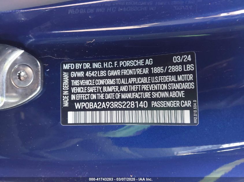 Color BlueCylinders 6Drive Full driveVIN WP0BA2A93RS******State Run & Drive VerifiedDamage Front rightAuction date 2025-03-24 AutoRIA