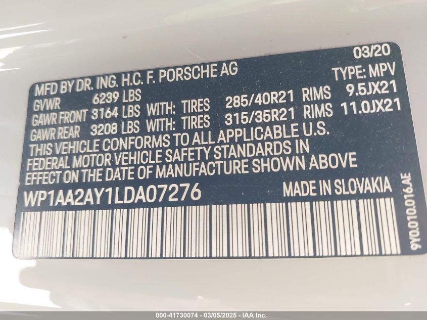 2020 PORSCHE CAYENNE 2020 Gasoline, 3.0, Full drive, VIN - WP1AA2AY1LD****** from the USA