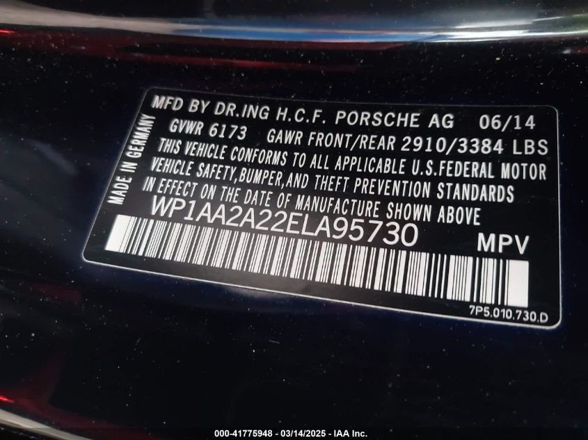 Color BlackCylinders 6Drive Full driveVIN WP1AA2A22EL******State Run & Drive VerifiedDamage Front or backAuction date 2025-03-25 AutoRIA