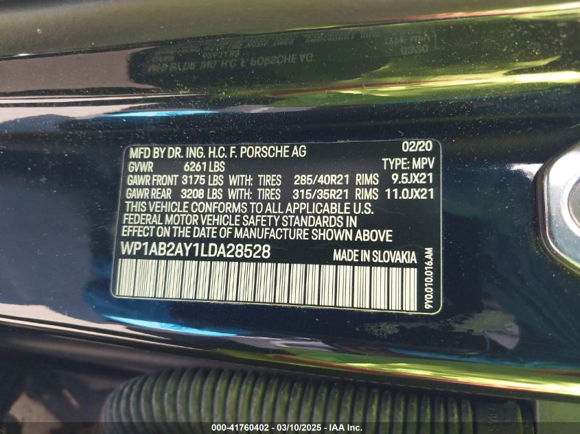 2020 PORSCHE CAYENNE 2020 Gasoline, 2.9, Full drive, VIN - WP1AB2AY1LD****** from the USA