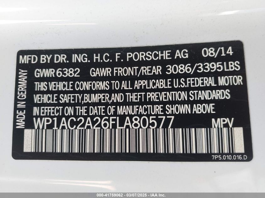 Color WhiteCylinders 8Drive Full driveVIN WP1AC2A26FL******State Run & Drive VerifiedDamage Front or backAuction date 2025-03-24 AutoRIA