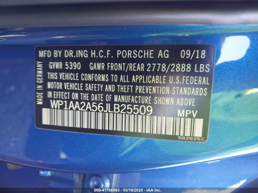Color BlueCylinders 4Drive Full driveVIN WP1AA2A56JL******State Run & Drive VerifiedDamage Left sideAuction date 2025-03-25 AutoRIA
