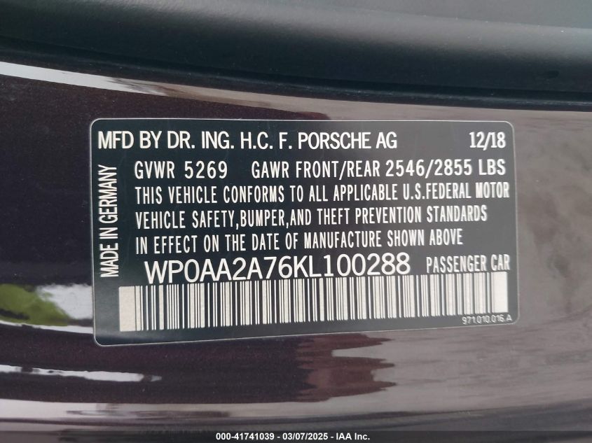 2019 PORSCHE PANAMERA 2019 Gasoline, 3.0, Full drive, VIN - WP0AA2A76KL****** from the USA