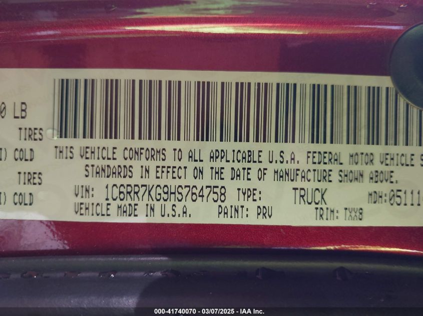 Color BurgundyCylinders 6Drive Full driveVIN 1C6RR7KG9HS******State Run & Drive VerifiedDamage Front right AutoRIA