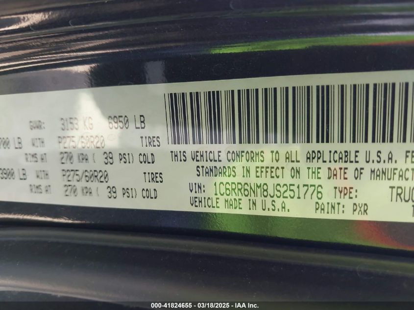 Color BlackCylinders 6Drive UnknownVIN 1C6RR6NM8JS******State Run & Drive VerifiedDamage Right side AutoRIA
