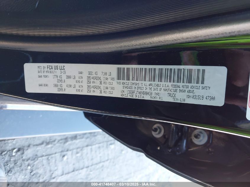 2019 RAM 1500 2019 Gasoline, 5.7, Full drive, VIN - 1C6SRFJTXKN****** from the USA