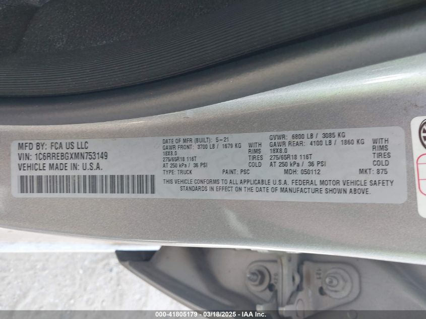 2021 RAM 1500 2021 Gasoline, 3.6, Unknown, VIN - 1C6RREBGXMN****** from the USA