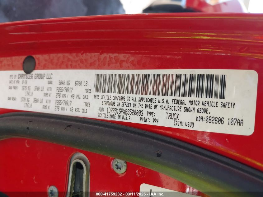 Color RedCylinders 8Drive UnknownVIN 1D7RB1GPXBS******State Run & Drive VerifiedDamage Back