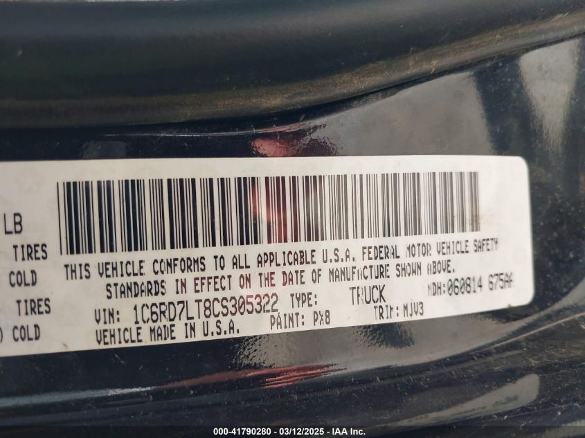 Color BlackCylinders 8Drive Full driveVIN 1C6RD7LT8CS******State Run & Drive VerifiedDamage Front and back