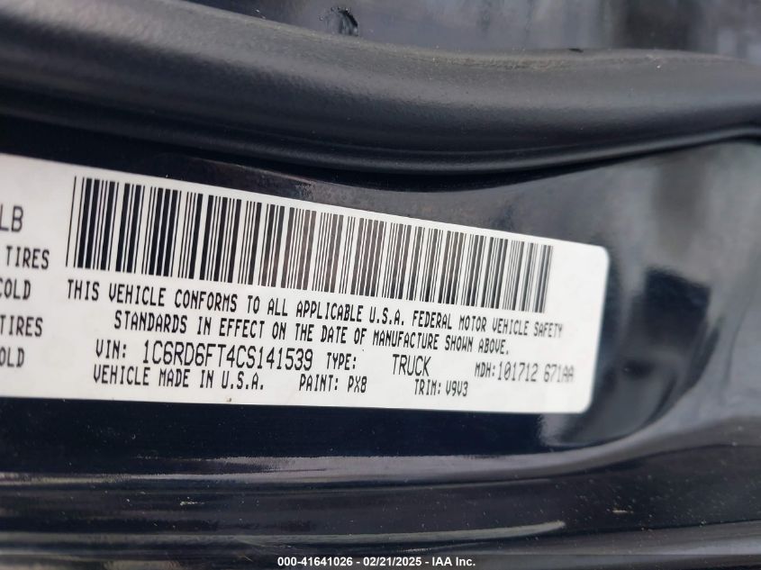 Color BlackCylinders 8Drive UnknownVIN 1C6RD6FT4CS******State Run & Drive VerifiedDamage Right side