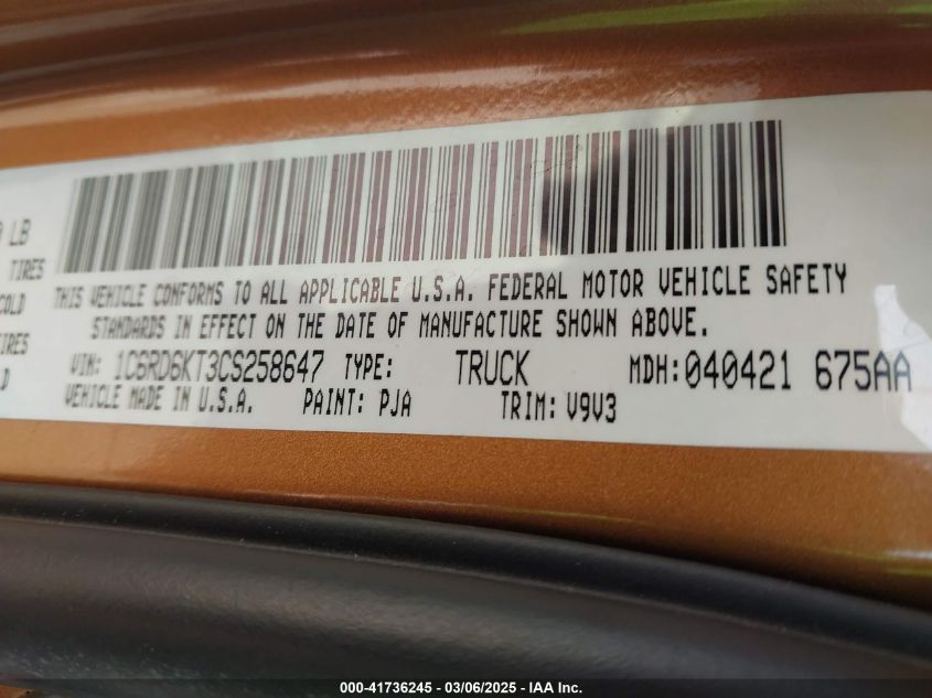 Color OrangeCylinders 8Drive UnknownVIN 1C6RD6KT3CS******State Run & Drive VerifiedDamage Front or back