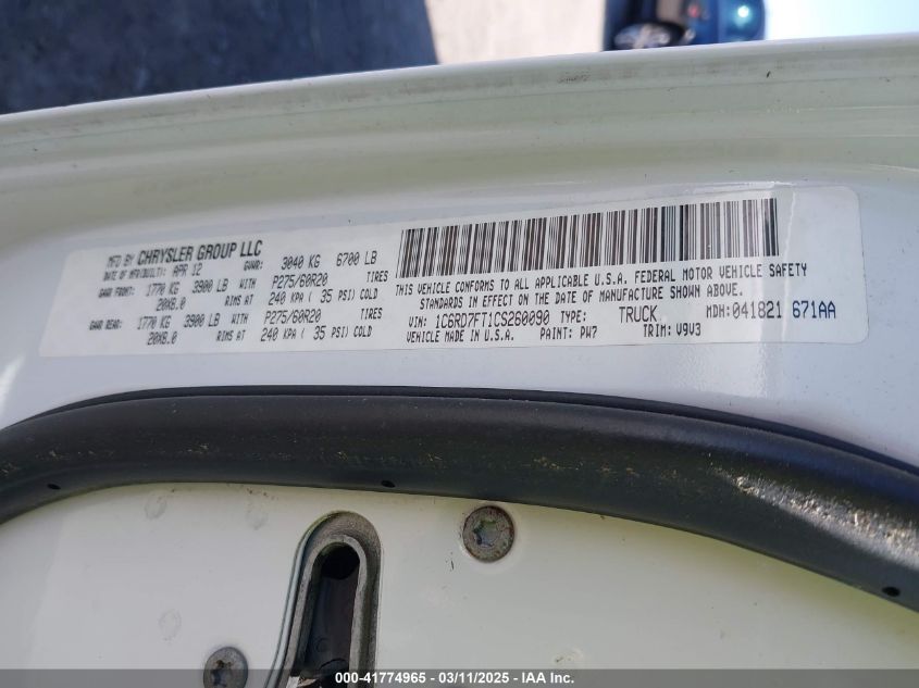 Color WhiteCylinders 8Drive Full driveVIN 1C6RD7FT1CS******State Run & Drive VerifiedDamage InsignificantAuction date 2025-03-21