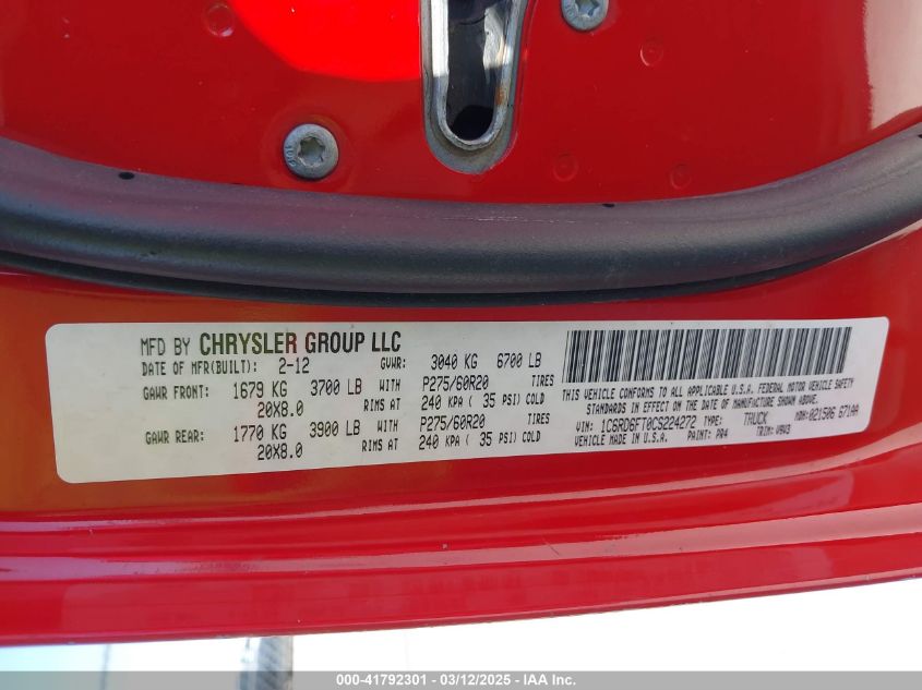 Color RedCylinders 8Drive UnknownVIN 1C6RD6FT0CS******State Run & Drive VerifiedDamage InsignificantAuction date 2025-03-20