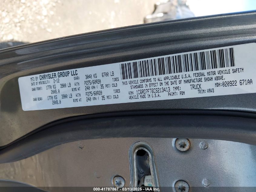 Color GrayCylinders 8Drive Full driveVIN 1C6RD7FT6CS******State Run & Drive VerifiedDamage InsignificantAuction date 2025-03-20