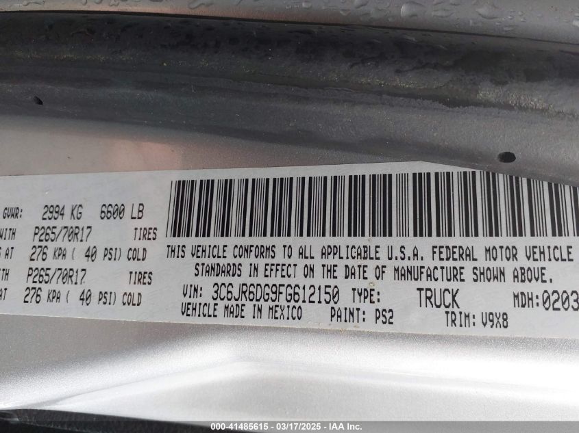Color SilverCylinders 6Drive UnknownVIN 3C6JR6DG9FG******State Run & Drive VerifiedDamage Front or backAuction date 2025-03-20 AutoRIA