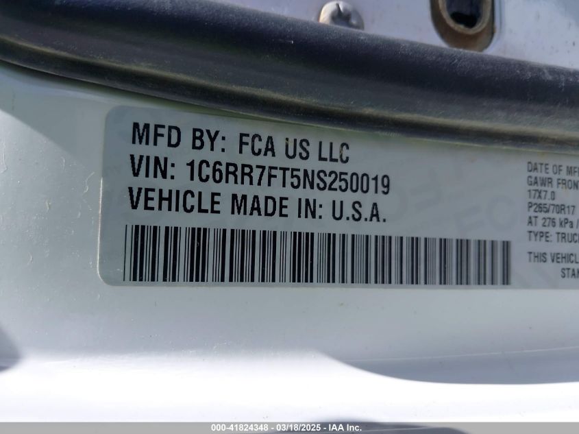 Color WhiteCylinders 8Drive Full driveVIN 1C6RR7FT5NS******State Run & Drive VerifiedDamage Front or back AutoRIA