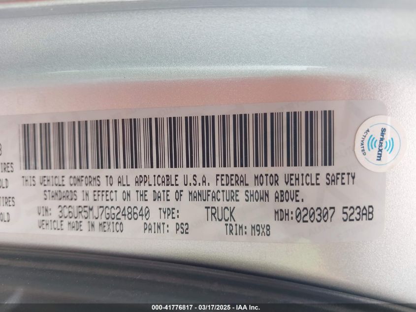 Color SilverCylinders 8Drive Full driveVIN 3C6UR5MJ7GG******State Run & Drive VerifiedDamage Right side